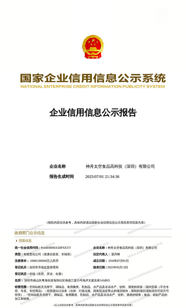 神舟太空食物高科技(深圳)无限公司是我国独一具有空间坐航天员产物研发、出产、发卖停业执照的大型太空食物企业集团,也是全球太空高科技食物的领航者。公司从停业务是将我国空间坐航天员正在太空糊口中的高科技食物进行平易近用化、财产化推广,让这些本来高不可攀的航天科技走进公共的日常糊口,为人类的健康糊口添加新的帮力。